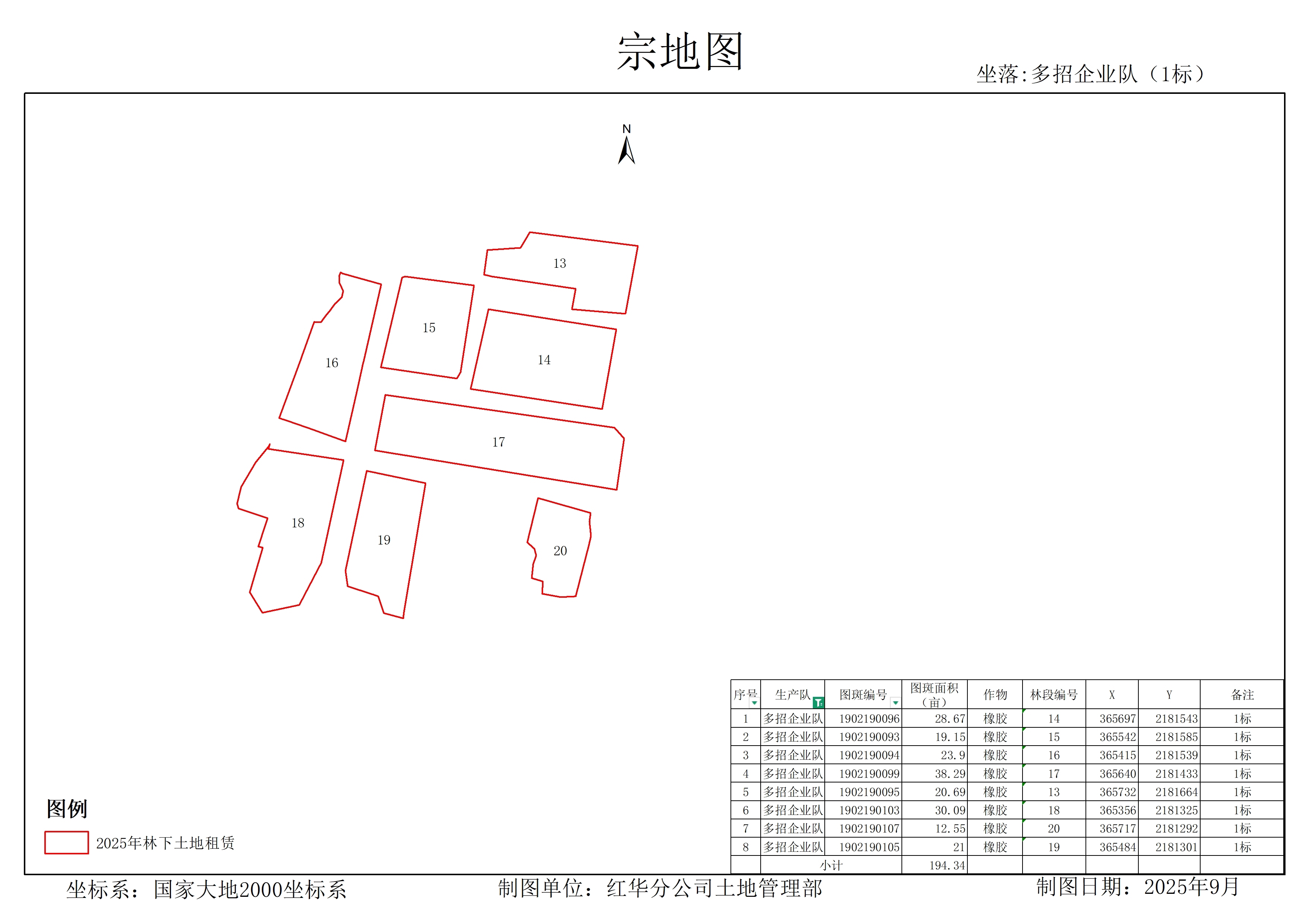 1、该出租地块于2025年已完成更新定植橡胶中小苗194.34亩,行距类型为7*2.7M,地块属于1级林地,郁闭度0级。拟出租地块地貌类型为为平原,土壤质地为壤土,坡度0°~5°的林下土地。该林下土地无灌溉设施,枯水期对其有较大影响。临路状况为国道,1km内有供电设施,通电便捷。