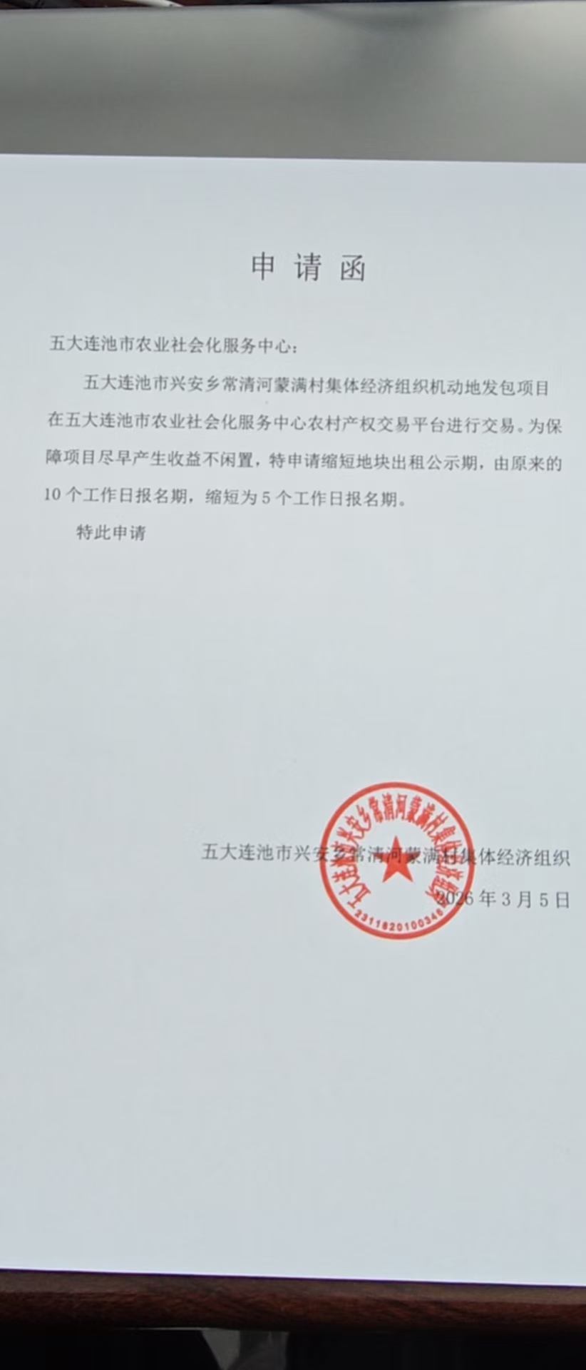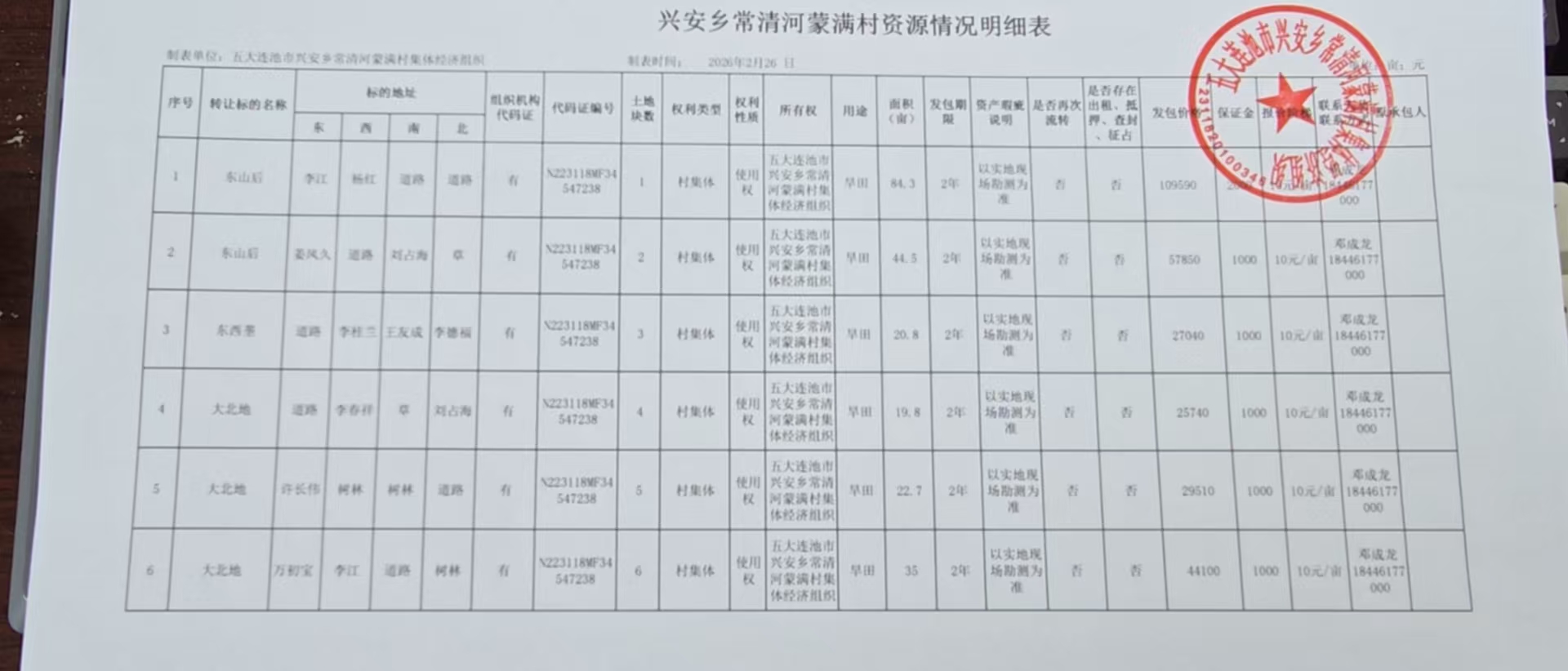 一、机动地位置及面积: 常清河蒙满村集体经济组织共有机动地6块,总面积227.1亩。 1号地面积84.3亩位于常清河村东山后,机动地四至:东:李江;西:杨红;南:道路;北:道路,承包年限:2年,承包金额109590元。 2号地面积44.5亩位于常清河村东山后,机动地四至:东:姜凤久;西:道路;南:刘占海;北:草,承包年限:2年,承包金额57850元。 3号地面积20.8亩位于常清河村北东西垄,机动地四至:东:道路;西:李桂兰;南:王友成;北:李德福,承包年限:2年,承包金额27040元。 4号地面积19.8亩位于常清河村大北地,机动地四至:东:道路;西:李春祥;南:草;北:刘占海,承包年限:2年,承包金额25740元。 5号地面积22.7亩位于常清河村大北地,机动地四至:东:许长伟;西:树林;南:树林;北:道路,承包年限:2年,承包金额29510元。 6号地面积35亩位于常清河村大北地,机动地四至:东:万初宝;西:李江;南:道路;北:树林,承包年限:2年,承包金额44100元。 二、承包权益及承包期限 所发包机动地均享受国家各项补贴政策,包含耕地力补贴。农村产权交易平台发包产生的服务费由承包方承担并支付。机动地承包期限自签订合同之日起至2027年12月30日止。 三、承包要求:当年承包费需在2026年3月30日前交清。经营方式应满足国家有关法律法规和政策要求,不得改变农业用地用途。承包费在中标后一次性交清本年度承包费并签定合同。下年度承包费需在2027年2月15日前交清,如果未按时交机动地承包费,村集体有权收回该机动地并重新发包。 因《中华人民共和国土地管理法》第十一条,农民集体所有的土地依法属于村农民集体所有的,由村集体经济组织或者村民委员会经营、管理。《物权法》第五十九条 农民集体所有的不动产和动产,属于本集体成员集体所有。故此次机动地竞价报名前,报名人员需前往五大连池市兴安乡常清河蒙满村进行身份验证。 四、全部进入五大连池市农业社会化服务中心农村产权交易平台进行交易。 项目联系人:刘先生 联系方式:0456-6338668 村级联系人:邓成龙 联系方式:18446177000