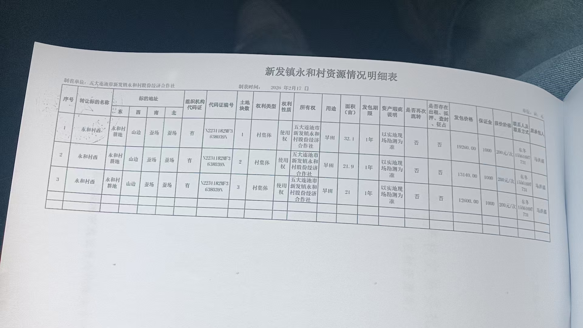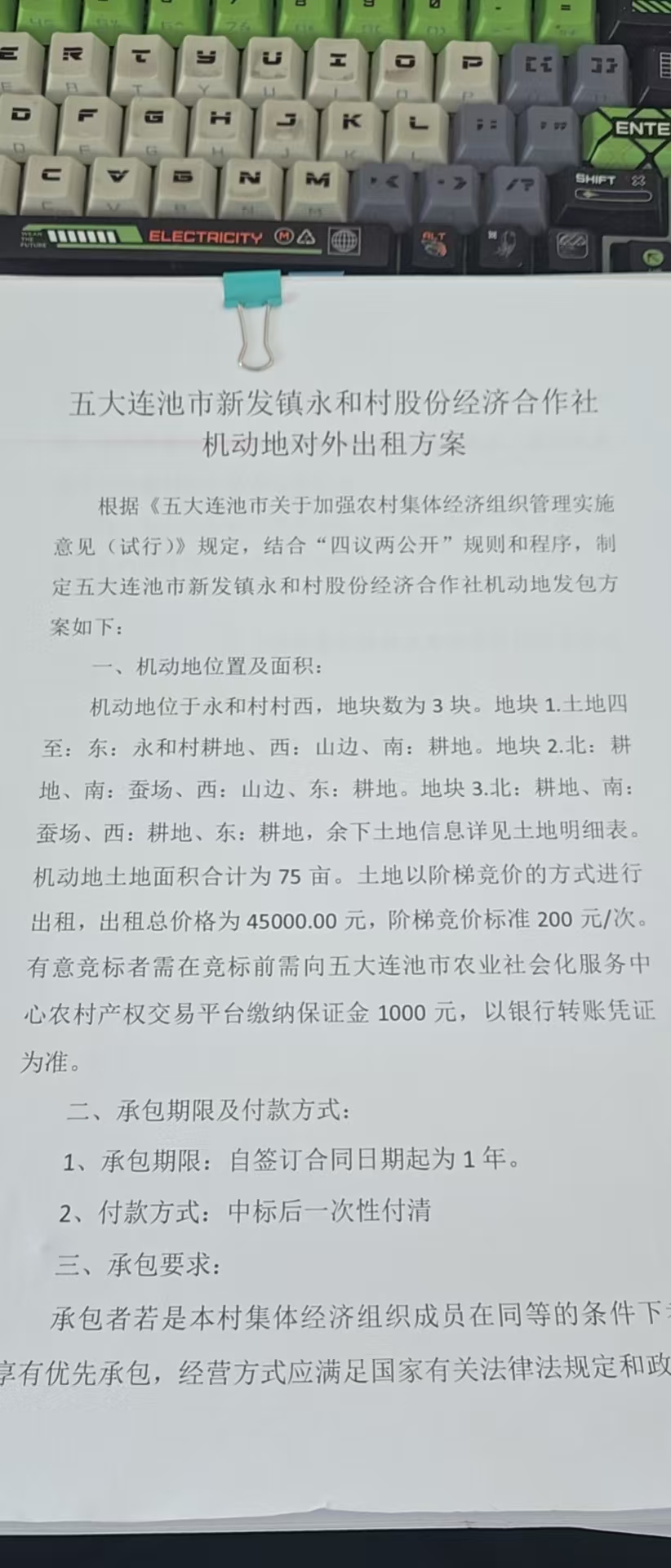 一、机动地位置及面积: 机动地位于永和村村西,地块数为3块。地块1.土地四至:东:永和村耕地、西:山边、南:耕地。地块2.北:耕地、南:蚕场、西:山边、东:耕地。地块3.北:耕地、南:蚕场、西:耕地、东:耕地,余下土地信息详见土地明细表。机动地土地面积合计为75亩。土地以阶梯竞价的方式进行出租,出租总价格为45000.00元,阶梯竞价标准200元/次。有意竞标者需在竞标前需向五大连池市农业社会化服务中心农村产权交易平台缴纳保证金1000元,以银行转账凭证为准。 二、承包期限及付款方式: 1、承包期限:自签订合同日期起为1年。 2、付款方式:中标后一次性付清 三、承包要求: 承包者若是本村集体经济组织成员在同等的条件下者享有优先承包,经营方式应满足国家有关法律法规定和政策要求,承包者在此块土地经营用途必须用于种植一年生农作物,且种植前必须与永和村股份经济合作社联系,商讨同意后方可实施耕种并要求现场看地。 四、五大连池市农业社会化服务中心农村产权交易平台所产生的所有费用由承包者承担。 联系人:刘先生 联系方式:0456-6338668