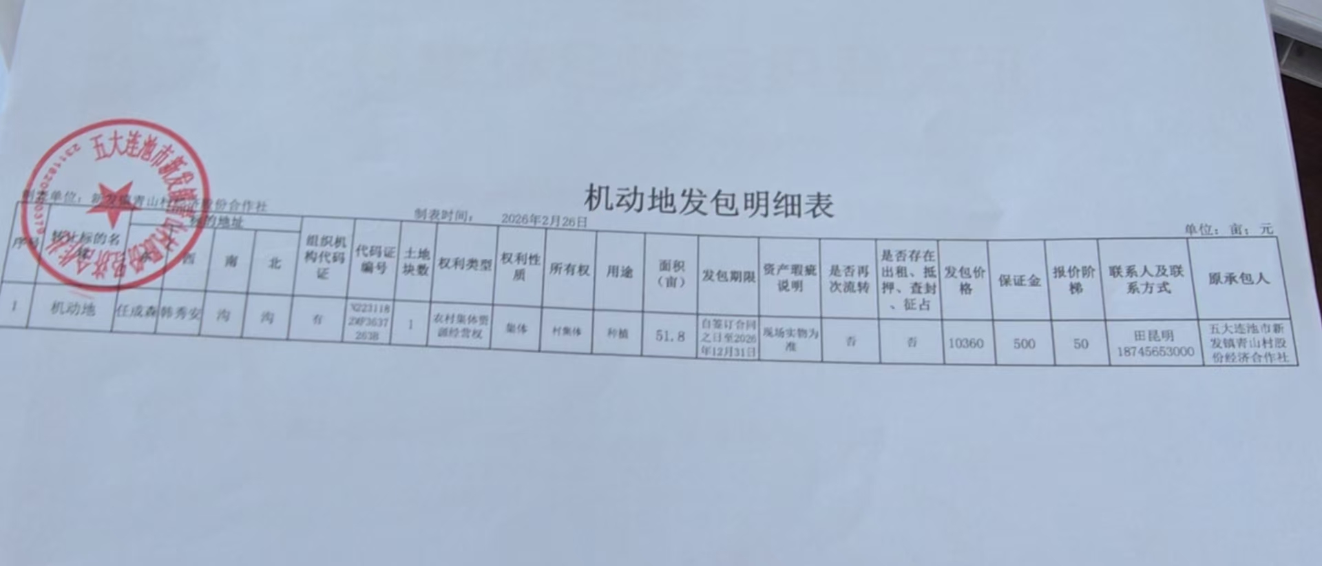 一、机动地位置及面积: 1.青山村机动地1号,土地四至:东;任成森、西:韩秀安、南:道、北:沟,面积51.8亩,每亩200元。出租价格:10360元。以阶梯竞价的方式出租,阶梯竞价标准50元/次.保证金1000元。 二、承包期限及付款方式: 1、承包期限:自签订合同日期起为1年。 2、付款方式:中标后一次性付清 三、承包要求: 承包者若是本村集体经济组织成员在同等的条件下者享有优先承包,经营方式应满足国家有关法律法规和政策要求,因该地块属于低洼地块属于粮食作物欠收地块,承包者在此块土地经营用途必须用于种植一年生农作物,且种植前必须与青山村股份经济合作社联系,商讨同意后方可实施耕种。 四、五大连池市农业社会化服务中心农村产权交易平台所产生的所有费用由承包者承担。 项目联系人:刘先生 联系方式:0456-6338668