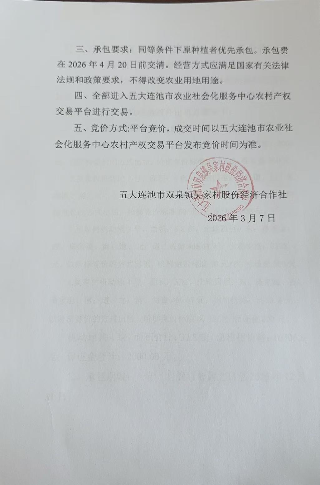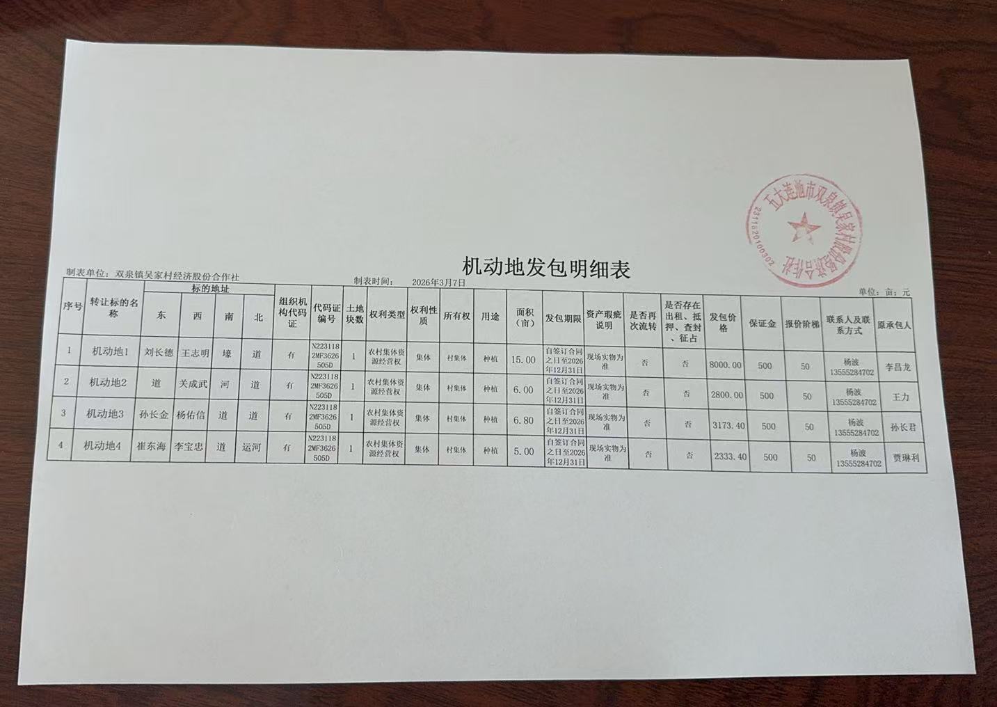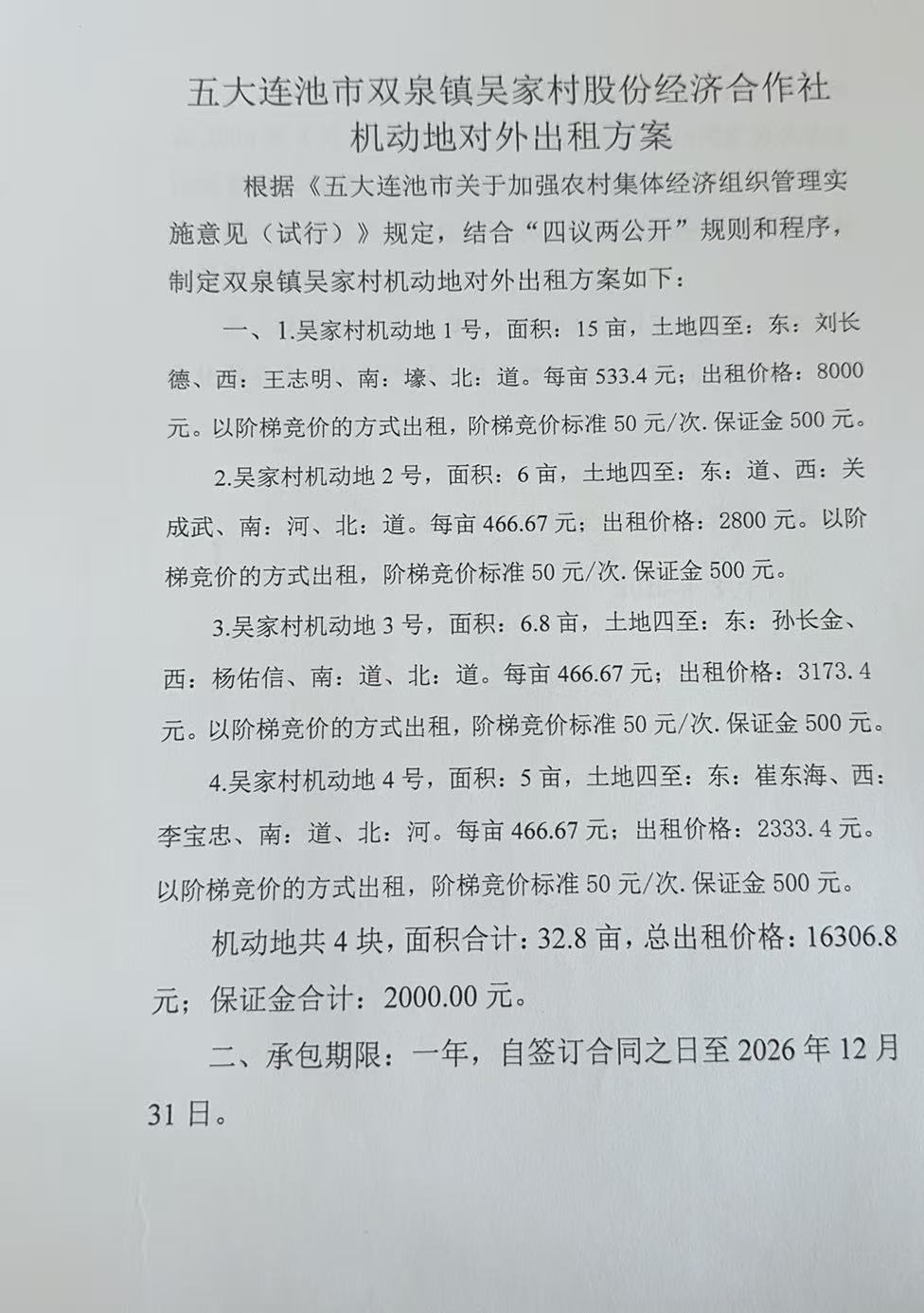 一、1.吴家村机动地1号,面积:15亩,土地四至:东:刘长德、西:王志明、南:壕、北:道。每亩533.4元;出租价格:8000元。以阶梯竞价的方式出租,阶梯竞价标准50元/次.保证金500元。 2.吴家村机动地2号,面积:6亩,土地四至:东:道、西:关成武、南:河、北:道。每亩466.67元;出租价格:2800元。以阶梯竞价的方式出租,阶梯竞价标准50元/次.保证金500元。 3.吴家村机动地3号,面积:6.8亩,土地四至:东:孙长金、西:杨佑信、南:道、北:道。每亩466.67元;出租价格:3173.4元。以阶梯竞价的方式出租,阶梯竞价标准50元/次.保证金500元。 4.吴家村机动地4号,面积:5亩,土地四至:东:崔东海、西:李宝忠、南:道、北:河。每亩466.67元;出租价格:2333.4元。以阶梯竞价的方式出租,阶梯竞价标准50元/次.保证金500元。 机动地共4块,面积合计:32.8亩,总出租价格:16306.8元;保证金合计:2000.00元。 二、承包期限:一年,自签订合同之日至2026年12月31日。 三、承包要求:同等条件下原种植者优先承包。承包费在2026年4月20日前交清。经营方式应满足国家有关法律法规和政策要求,不得改变农业用地用途。 四、全部进入五大连池市农业社会化服务中心农村产权交易平台进行交易。 五、竞价方式:平台竞价,成交时间以五大连池市农业社会化服务中心农村产权交易平台发布竞价时间为准。 项目联系人:刘先生 联系方式:0456-6338668