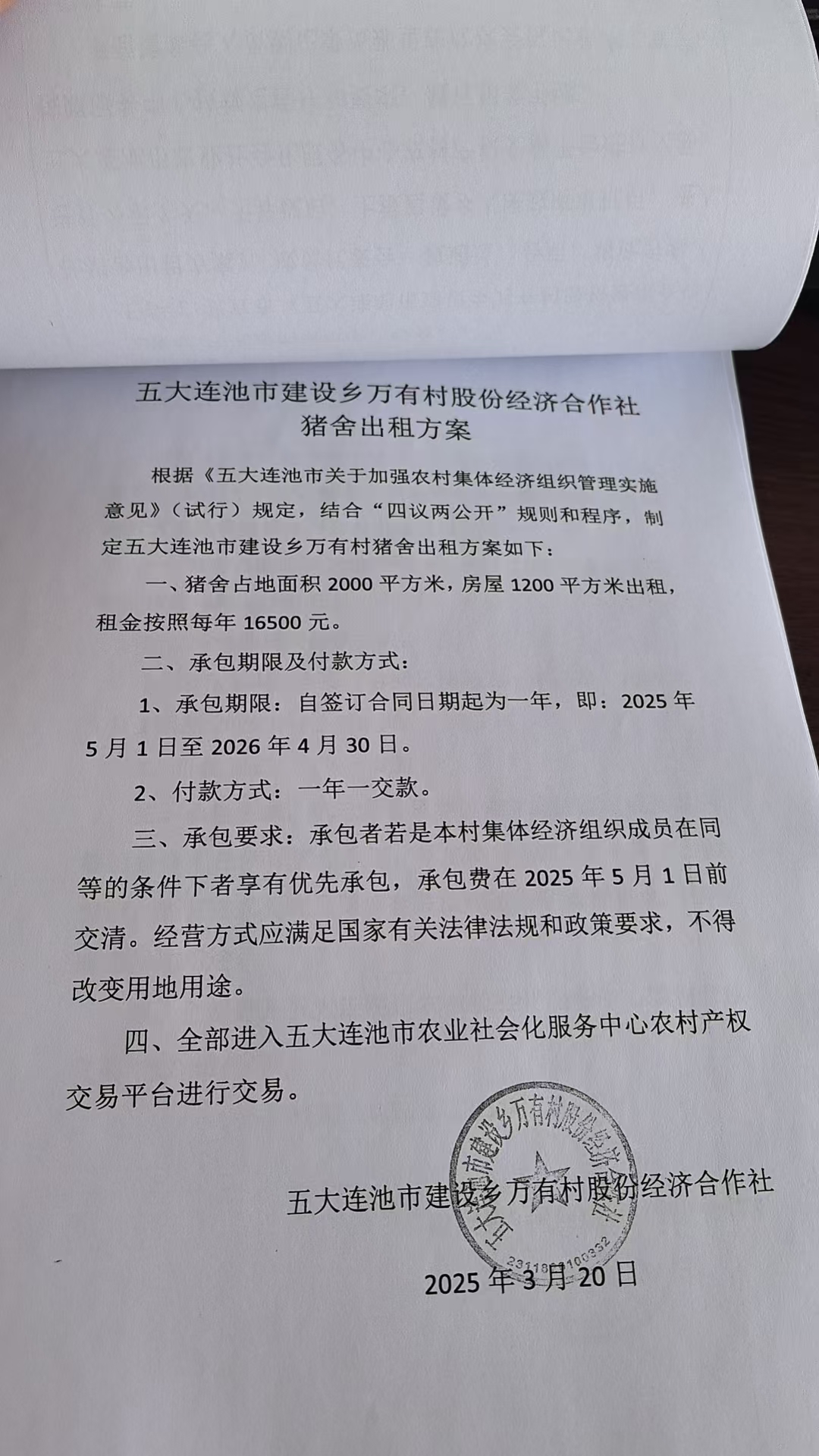 一、猪舍占地面积2000平方米,房屋1200平方米出租,租金按照每年16500元。 二、承包期限及付款方式: 1、承包期限:自签订合同日期起为一年,即:2025年5月1日至2026年4月30日。 2、付款方式:一年一交款。 三、承包要求:承包者若是本村集体经济组织成员在同等的条件下者享有优先承包,承包费在2025年5月1日前交清。经营方式应满足国家有关法律法规和政策要求,不得改变用地用途。 四、全部进入五大连池市农业社会化服务中心农村产权交易平台进行交易。 联系人:霍先生 联系方式:0456-6338668