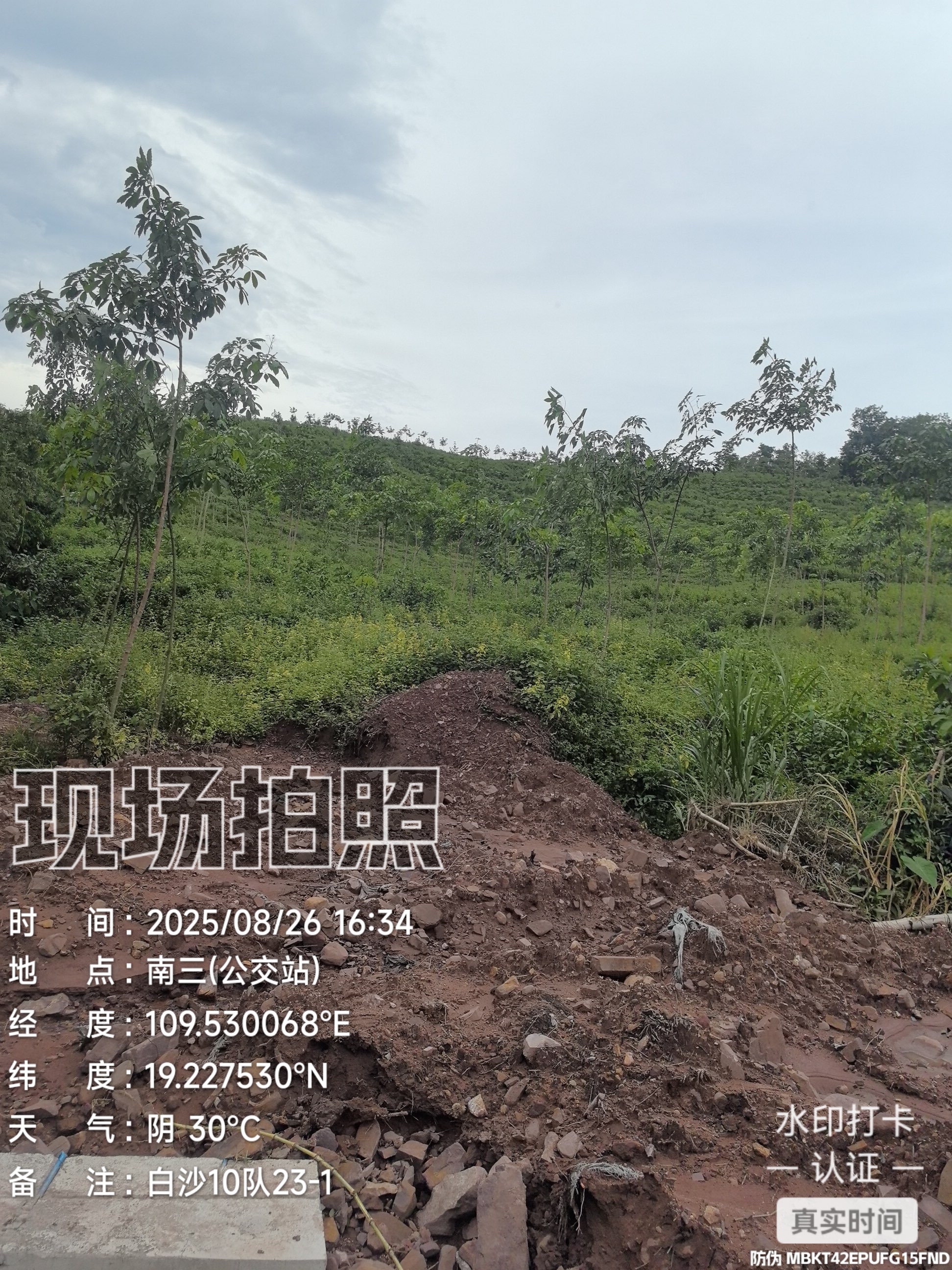 1、该拟出租地块于2023年完成更新定植,定植橡胶株行距类型为 7*2.8,郁闭度0级。地貌类型为三级山地,土壤质地为含风化石较多的红壤,坡度35°左右,基础设施条件(描述灌溉水源、排水条件、临路状况、通电便捷等情况) ,排水条件良好,林间道路良好,没有通电。依据《海胶集团国有农用地租金指导价成果报告》中评分标准,经实地打分,评定此地块为郁闭度0级的3级林下土地。