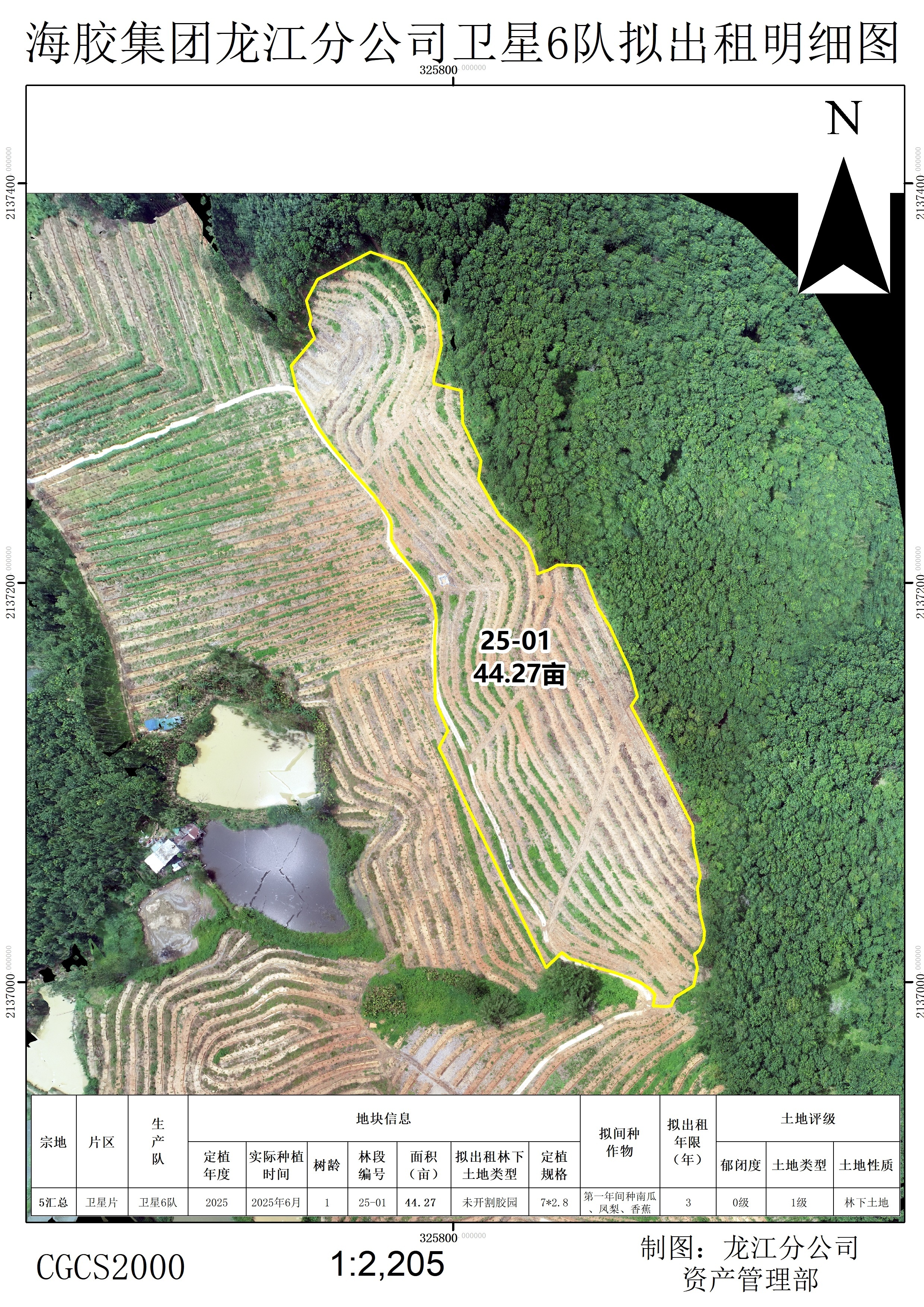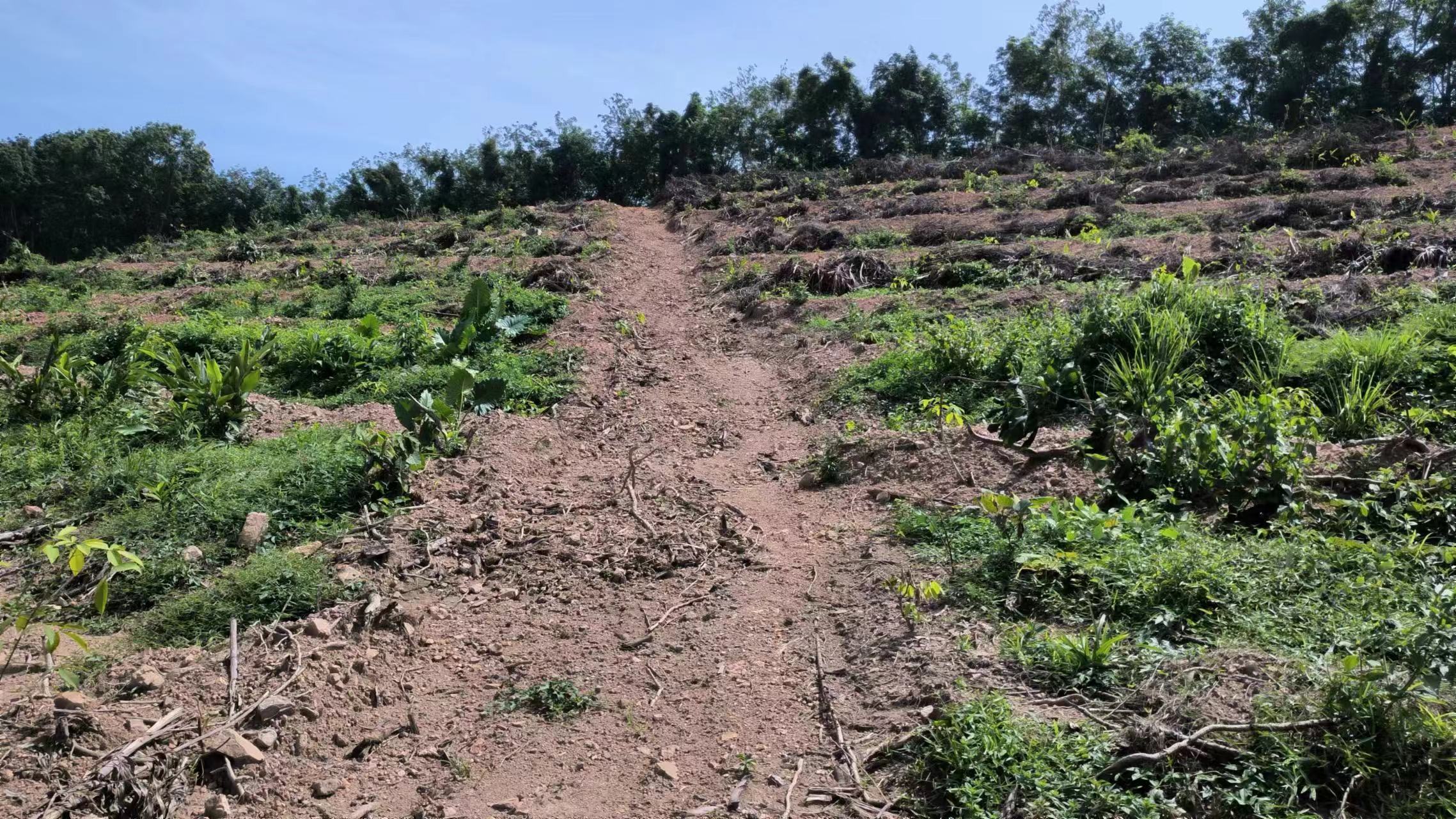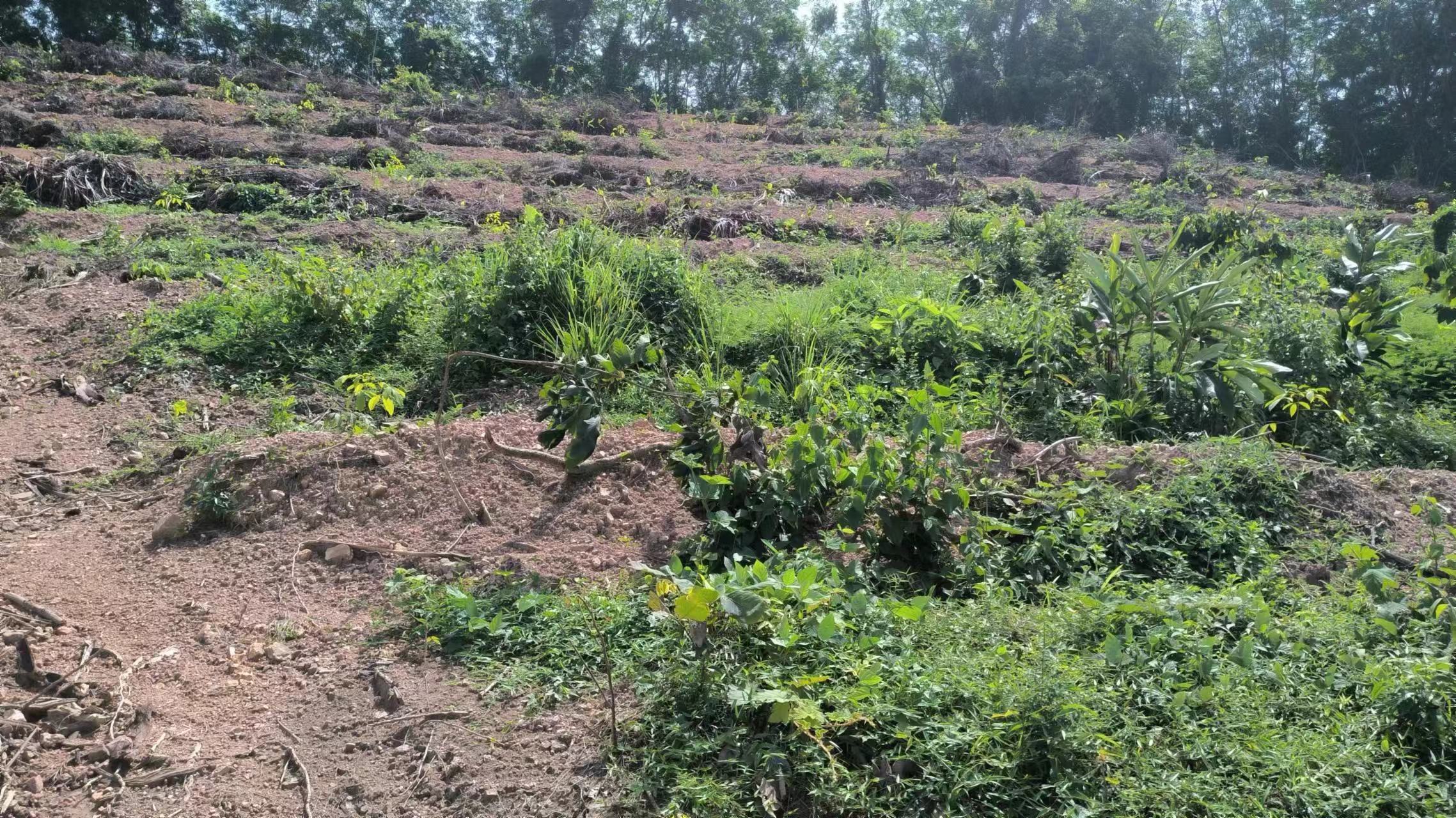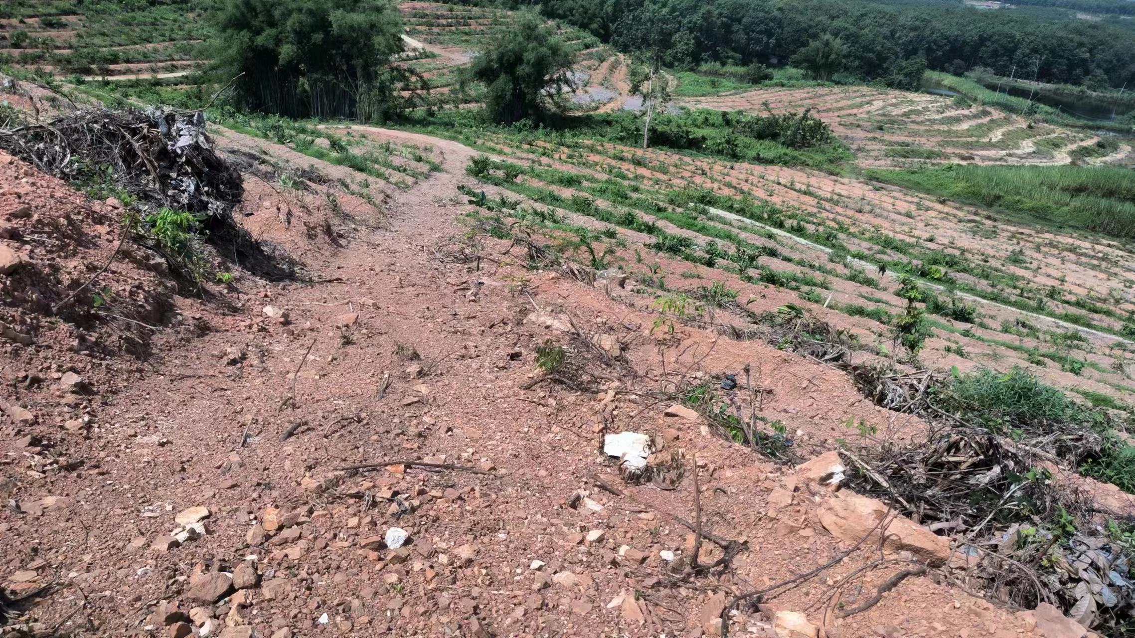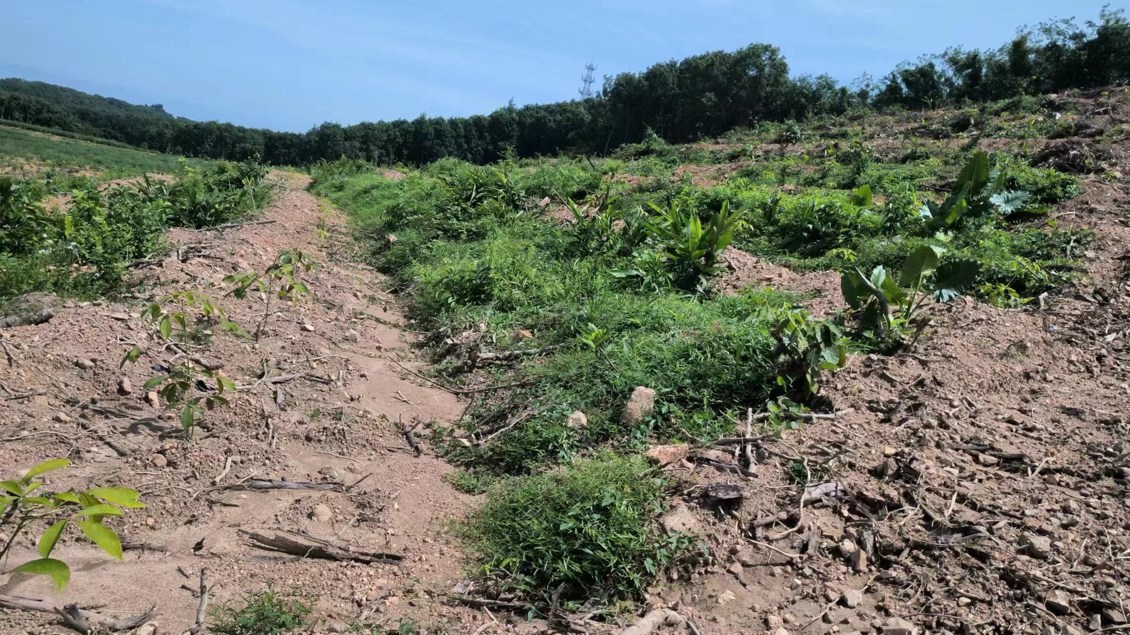 1、该出租地块于2025年已完成更新定植橡胶中小苗44.27亩,行距类型为7*2.8M,地块属于二级林地,郁闭度为0级。地貌类型为二类型地,土壤质地为砂土,坡度在25度以上,基础设施条件为水源(鱼塘)灌溉及基础通电设施距离大约1000米,1000米内有3米宽水泥硬化道路。