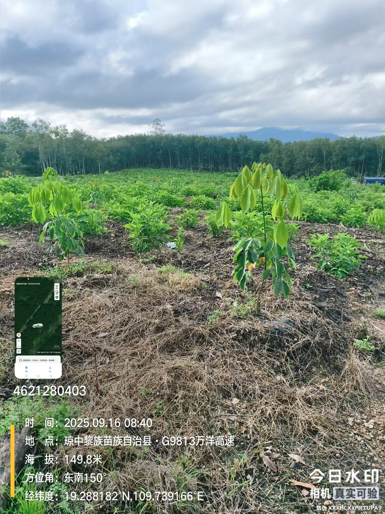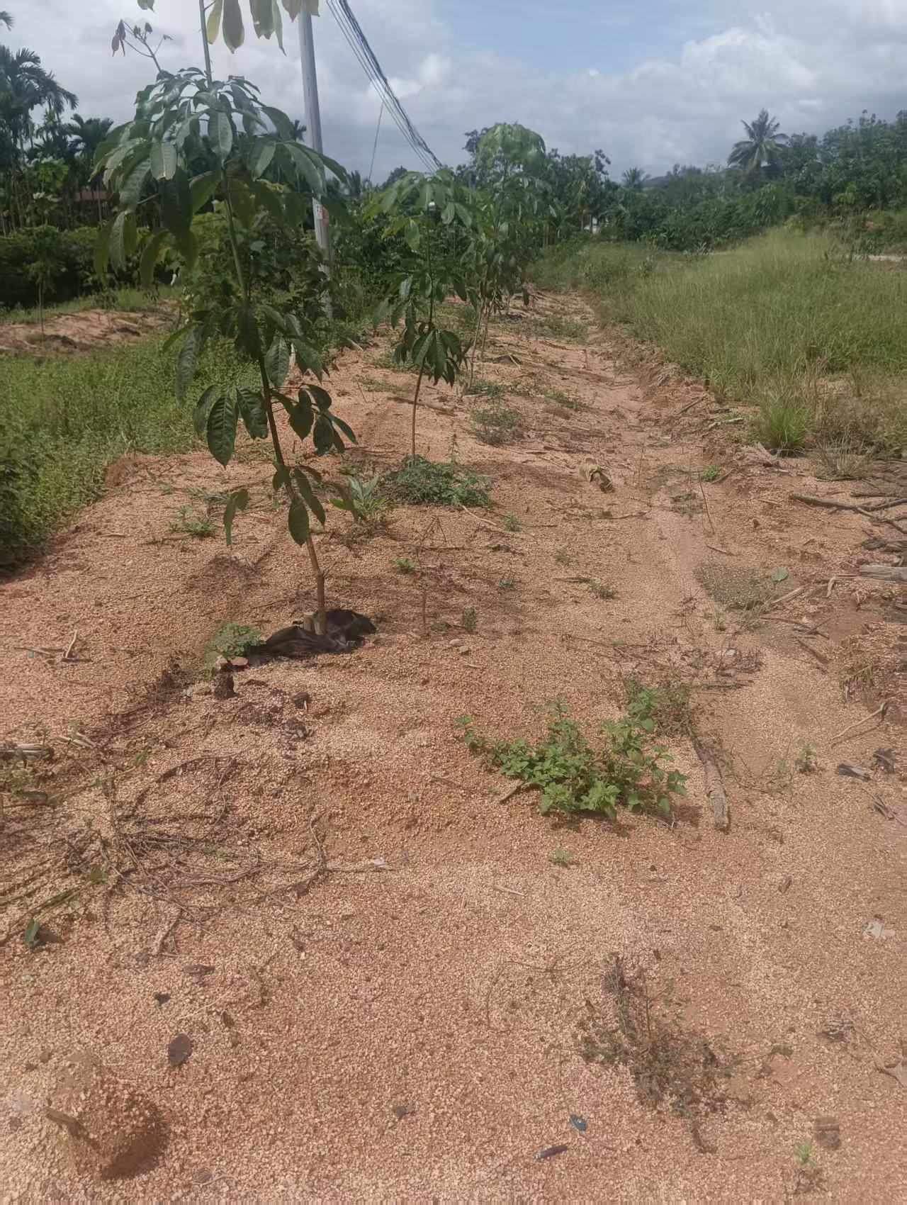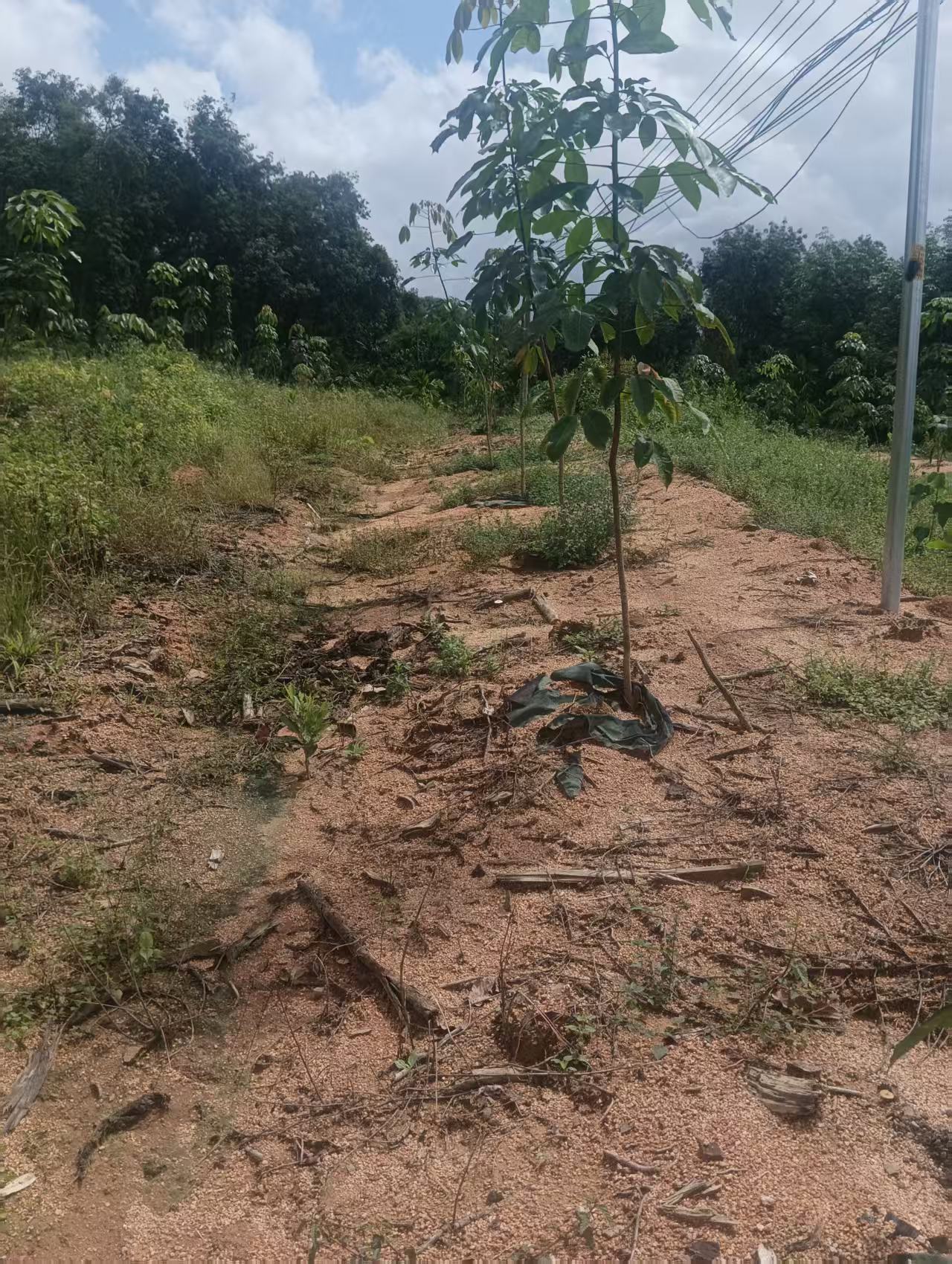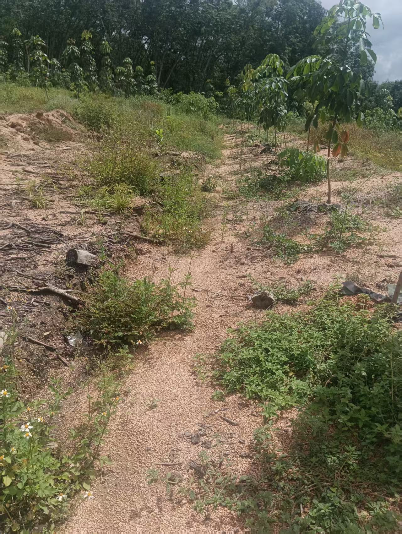 1、该地块于2024年更新定植种植橡胶中小苗,橡胶株行距类型为常规种植(7*2.8M),地块为郁闭度0级的一级林下土地,整体地貌类型为平原地。